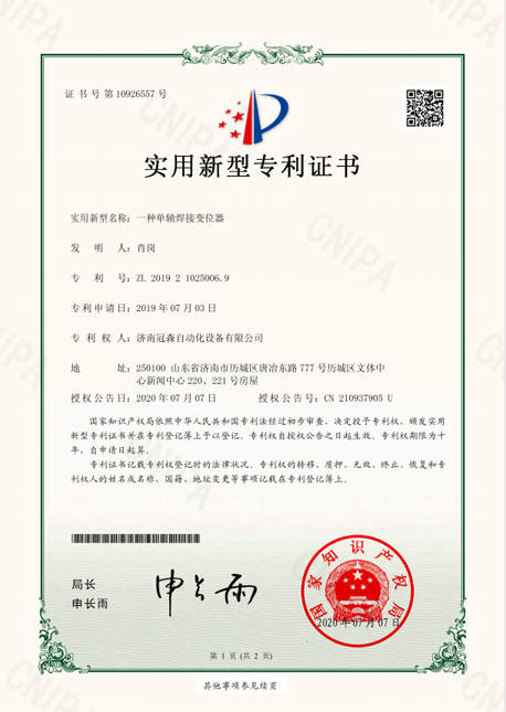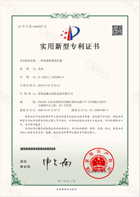 實(shí)用新型專(zhuān)利證書(shū)一種單軸焊接變位器