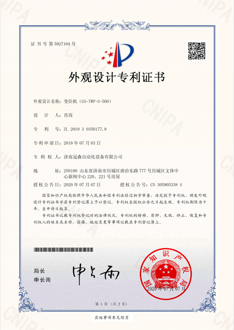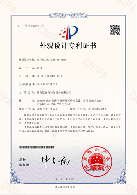 外觀設(shè)計(jì)專(zhuān)利證書(shū) 變位機(jī)GS-SWP-ZW-500
