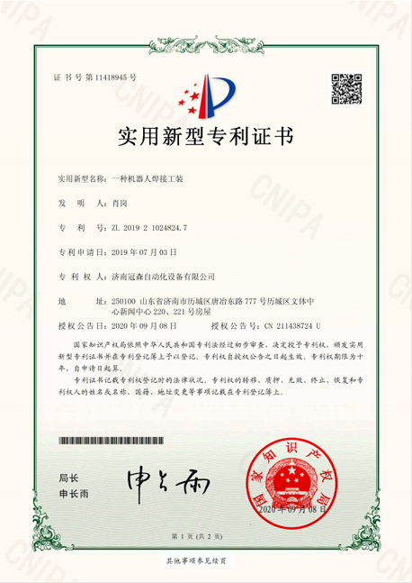 實(shí)用新型專(zhuān)利證書(shū) 一種機(jī)器人焊接工裝